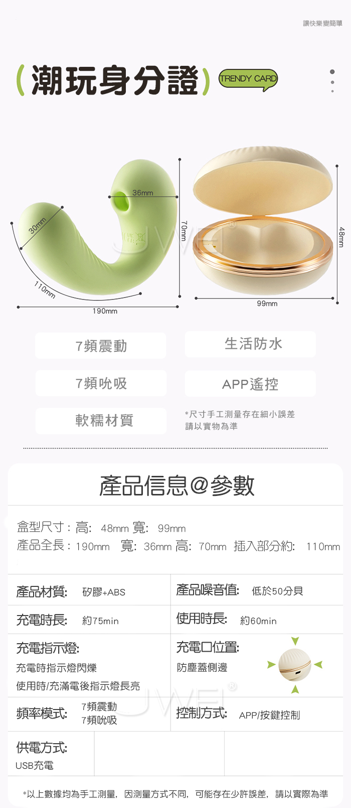 蜜豆裹吸 溫柔模擬唇愛,口口高潮的誘惑 寶盒收納,防塵又隱蔽 放在辦公桌上,同事以為是粉餅盒,清洗擦乾後放入,不落灰,不社死! 產品規格 ■尺寸:大小詳如圖片標示 ■材質:TPE+ABS ■功能:7頻震動、7頻吮吸、APP遙控、生活防水