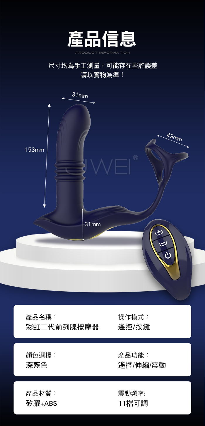 彩虹伸縮二代,前列腺按摩器。 好產品特性 往往都一目了然,你想要的他都能滿足 前列腺被稱為男人的G點,快感是丁丁的10倍 產品規格 ■產品材質:TPE+ABS ■規格:詳如下圖所示 ■功能:11頻伸縮強震、無線遙控 ■供電方式:USB充電