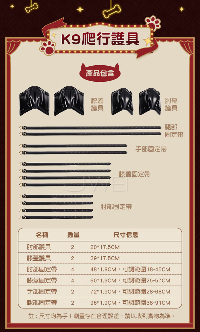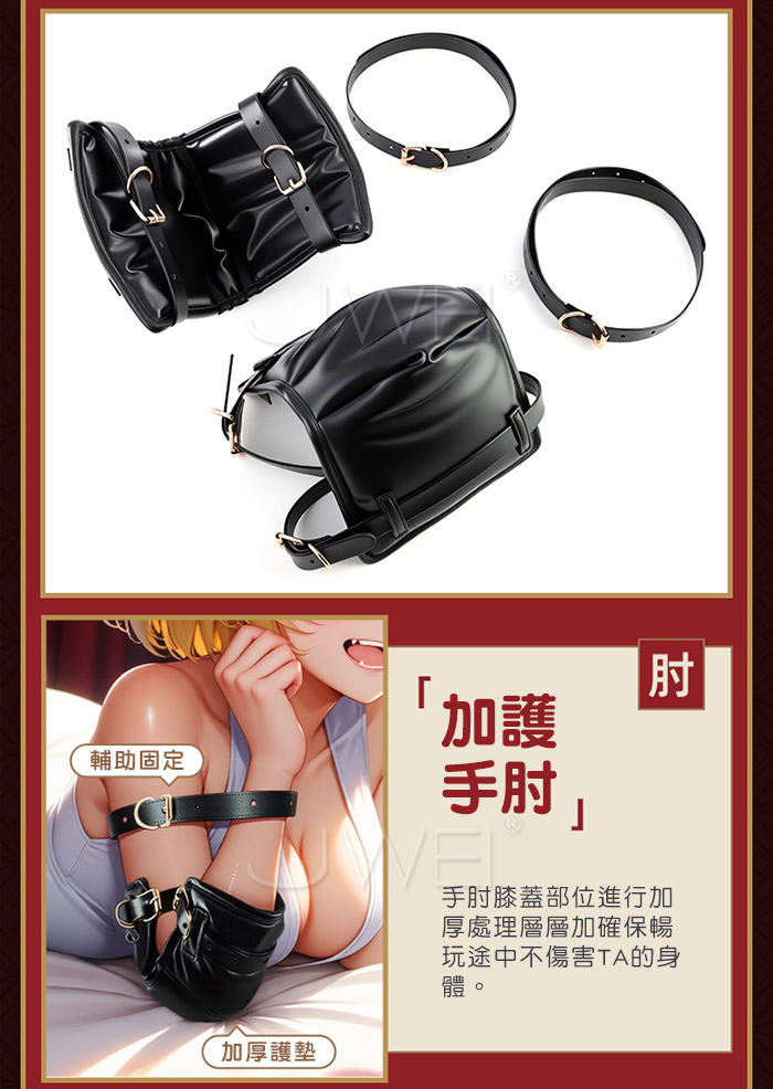 加厚海綿 跪爬不痛,肘膝防護,手肘膝蓋部位進行加厚處理層層加確保暢玩途中不傷害TA的身體。 遊玩更輕鬆,整體由,PU縫製,內含加厚海綿墊適合長時間配戴遊戲。 ■尺寸:大小詳如圖片標示 ■材質:PU+海綿 ■功能:閨房情趣、束縛調教 ■注意:SM道具請以安全、清醒、非強迫為使用原則,使用前請先徵得對方的同意;使用時如有任何不適,請立即停止使用。