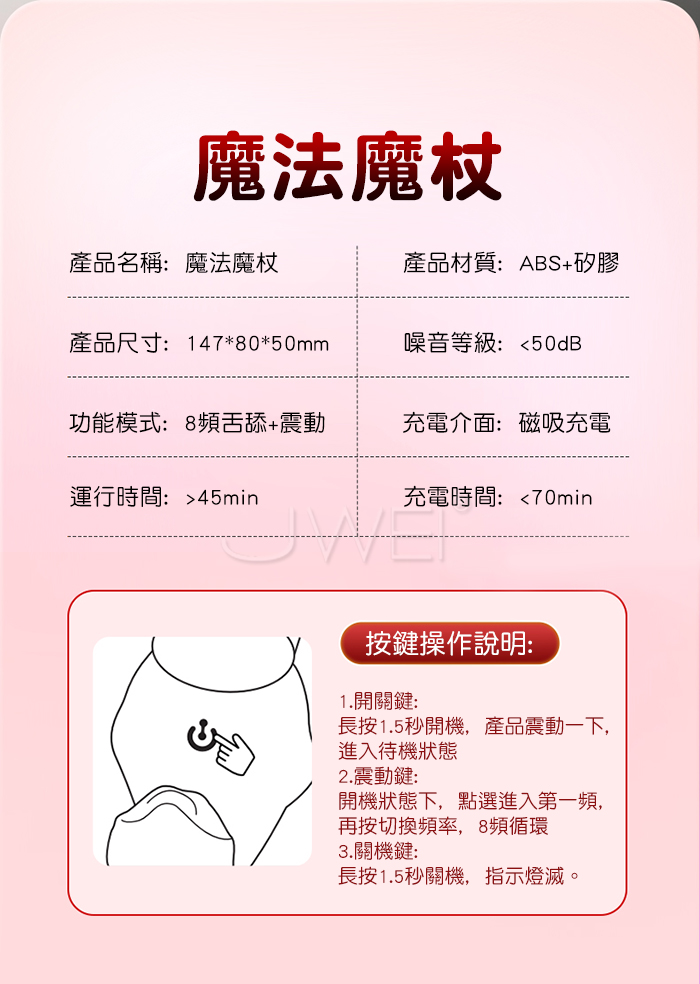 “魔法”一觸秒入高潮宇宙,這才是你的第一根魔杖 入體即震G點,不用費勁找放進去就能頂到 先震後舔,精准刺激蒂蒂,初享愉悅也能掌控高潮 產品規格 ■尺寸:大小詳如圖片標示 ■材質:矽膠+ABS ■特色:8頻舌舔震動